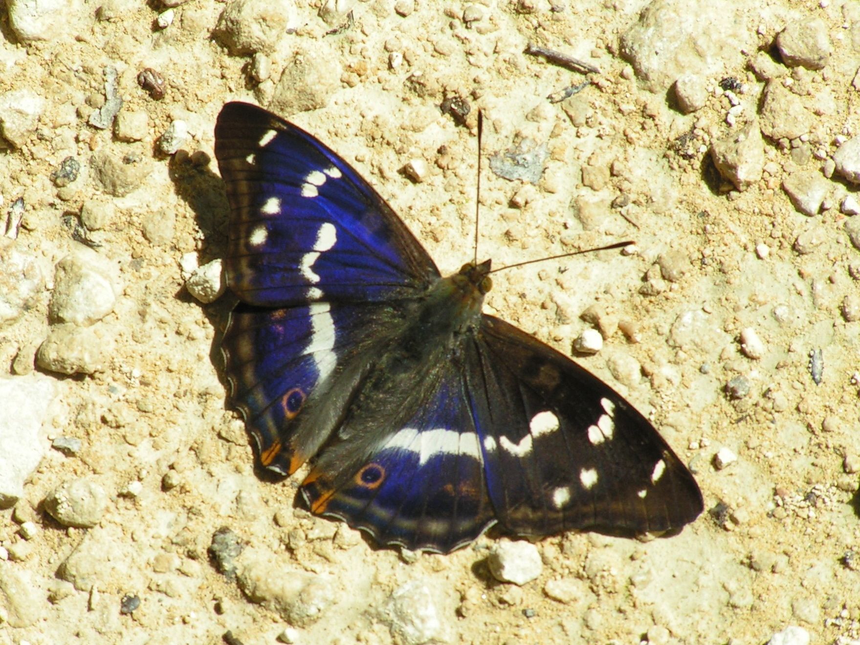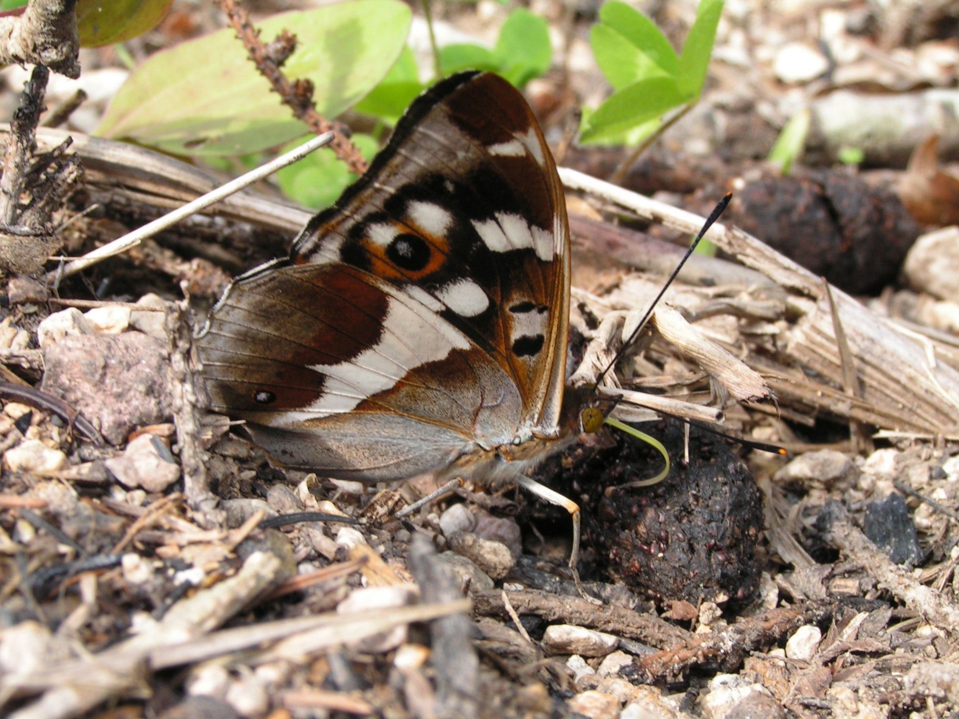 Adultes : grand papillon, dessus des ailes brun-noir avec des dessins blancs avec des ocelles sur les ailes postérieures; le mâle possède des reflets bleu-violacés. Le revers des ailes est coloré de brun-orange et gris avec une strie blanche contrastante, les ailes antérieures présentent un grand ocelle tandis que les postérieures en arborent un petit.
