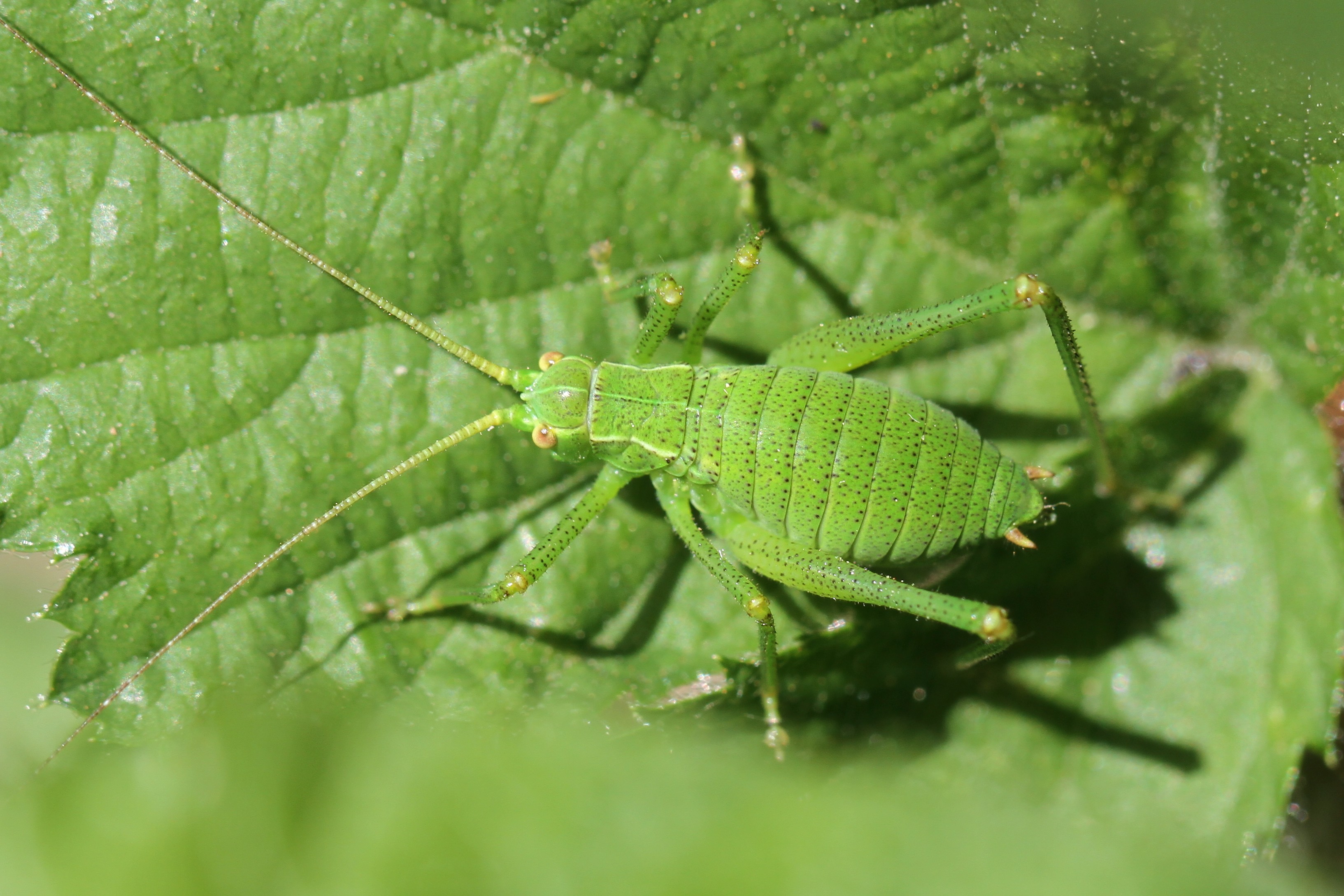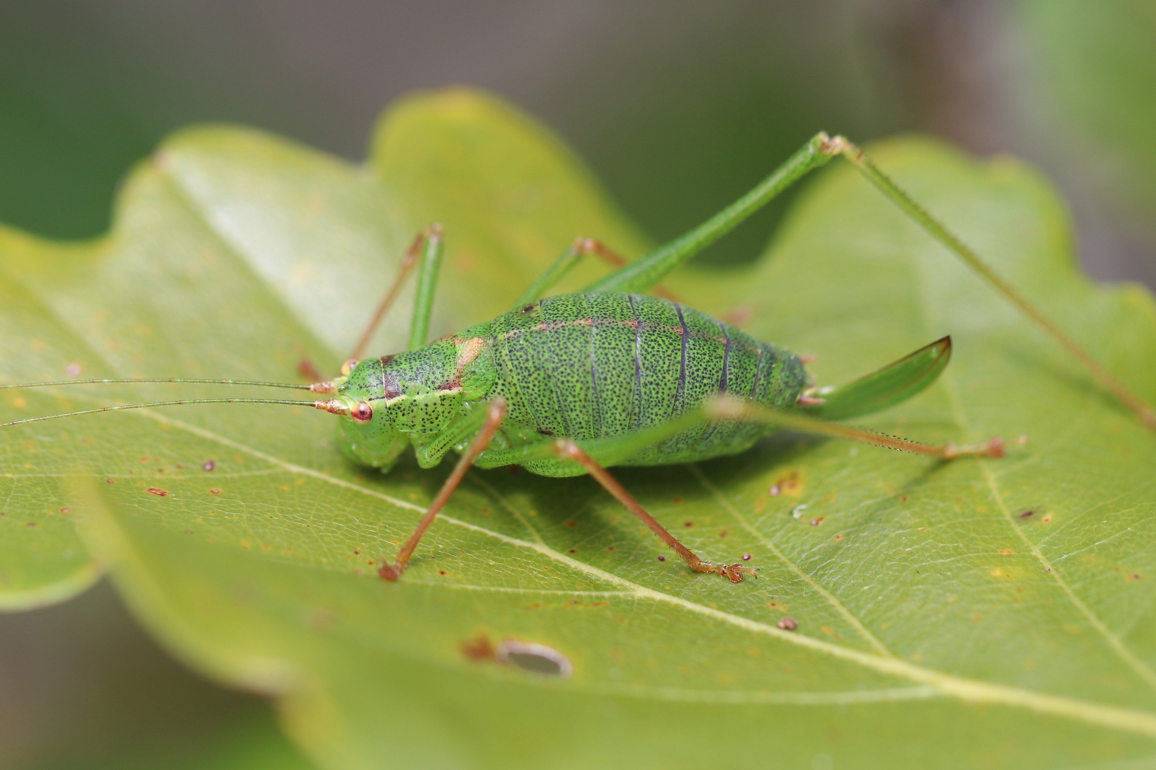 La Leptophye ponctuée est une très petite sauterelle de couleur vert-tendre ponctuée de noir. Elle a un trait de couleur crème à l’arrière de l’œil, qui se prolonge jusqu’aux ailes. Elle possède des ailes très réduites qui ne lui permettent pas de voler. Ses antennes atteignent quatre fois la longueur de son corps, ce qui la différencie des criquets. La femelle possède un oviscapte aplati, en forme de faux, qui lui permet de déposer ses œufs dans les fissures de l’écorce des arbres et sur les feuilles et tiges.
