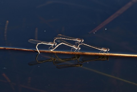 Entre décembre et mars, après la formation du tandem et du cœur copulatoire, la femelle, seule ou tenue par le mâle, va pondre ses œufs dans les débris de végétaux flottants à la surface de l’eau. Les œufs éclosent, puis la phase larvaire donne lieu à une nouvelle génération estivale. Les hivers trop doux entraînent une diminution des pontes. Les adultes passent l’hiver abrités dans des secteurs forestiers et meurent à la fin du printemps, après la saison de reproduction. En considérant les deux générations successives, la période de vol des adultes s’étend du mois de février au mois de novembre.