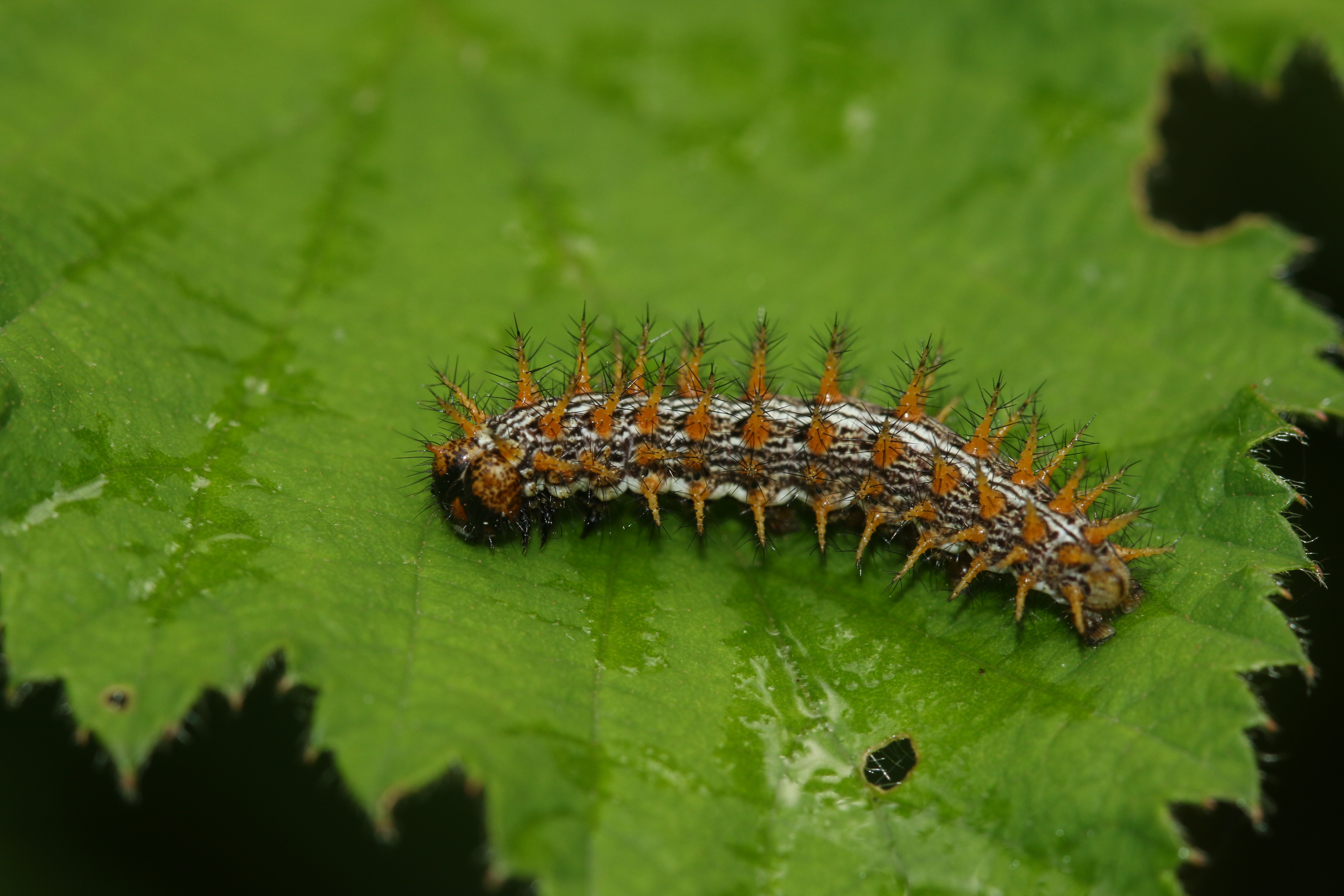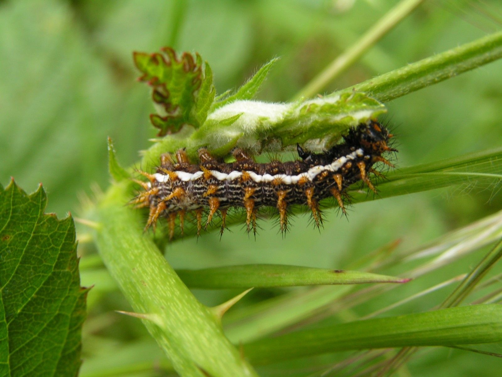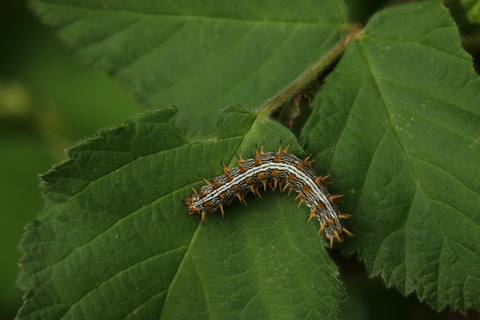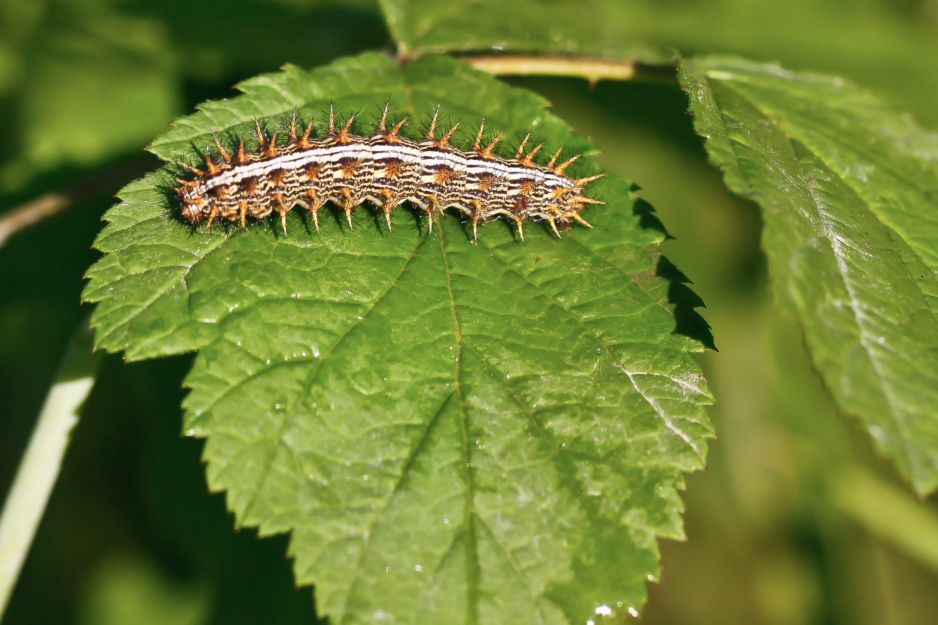 Chenille : la chenille est ressemblante à celles des autres nacrés avec des lignes blanches longitudinales et des protubérances orange.