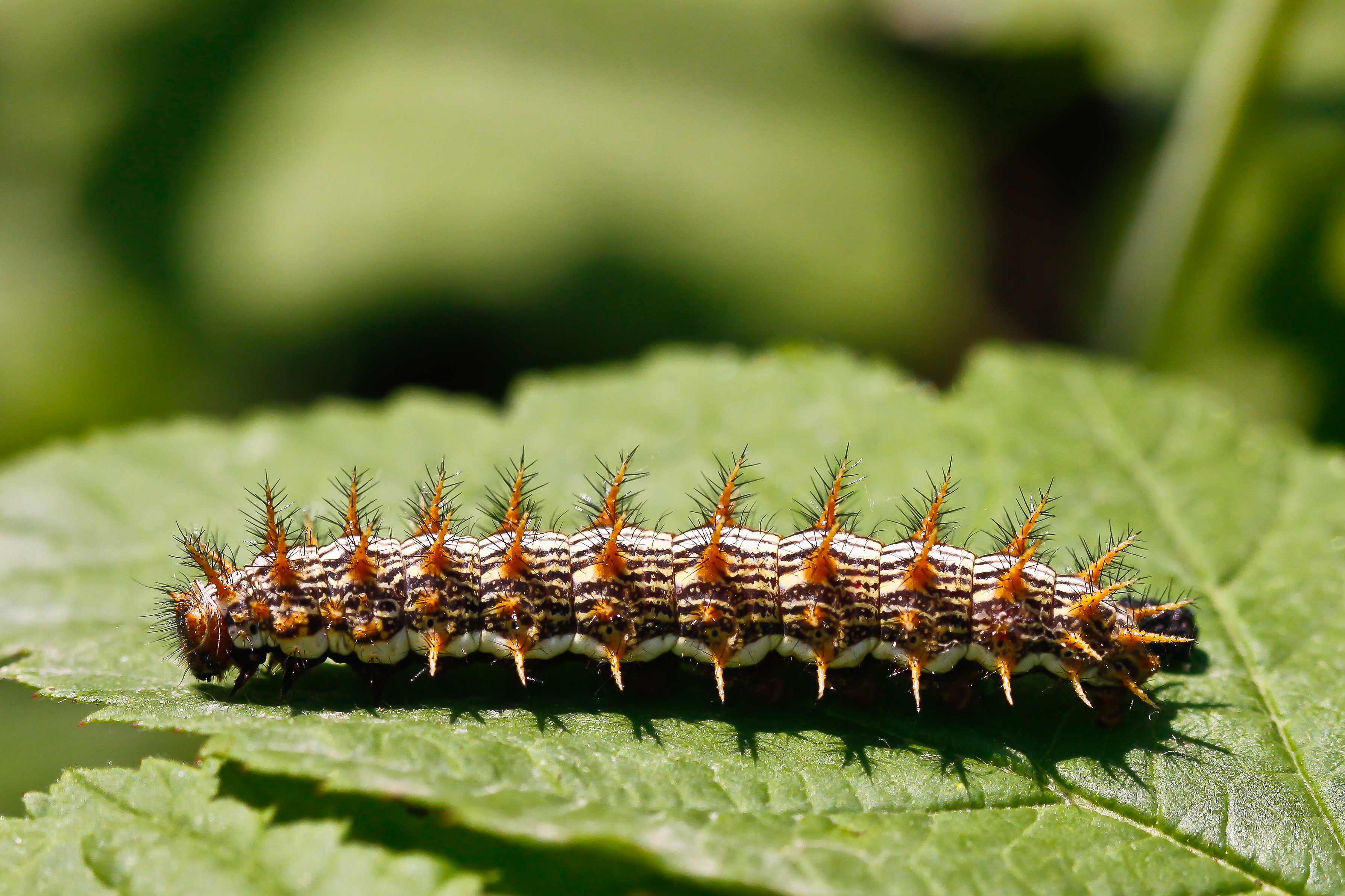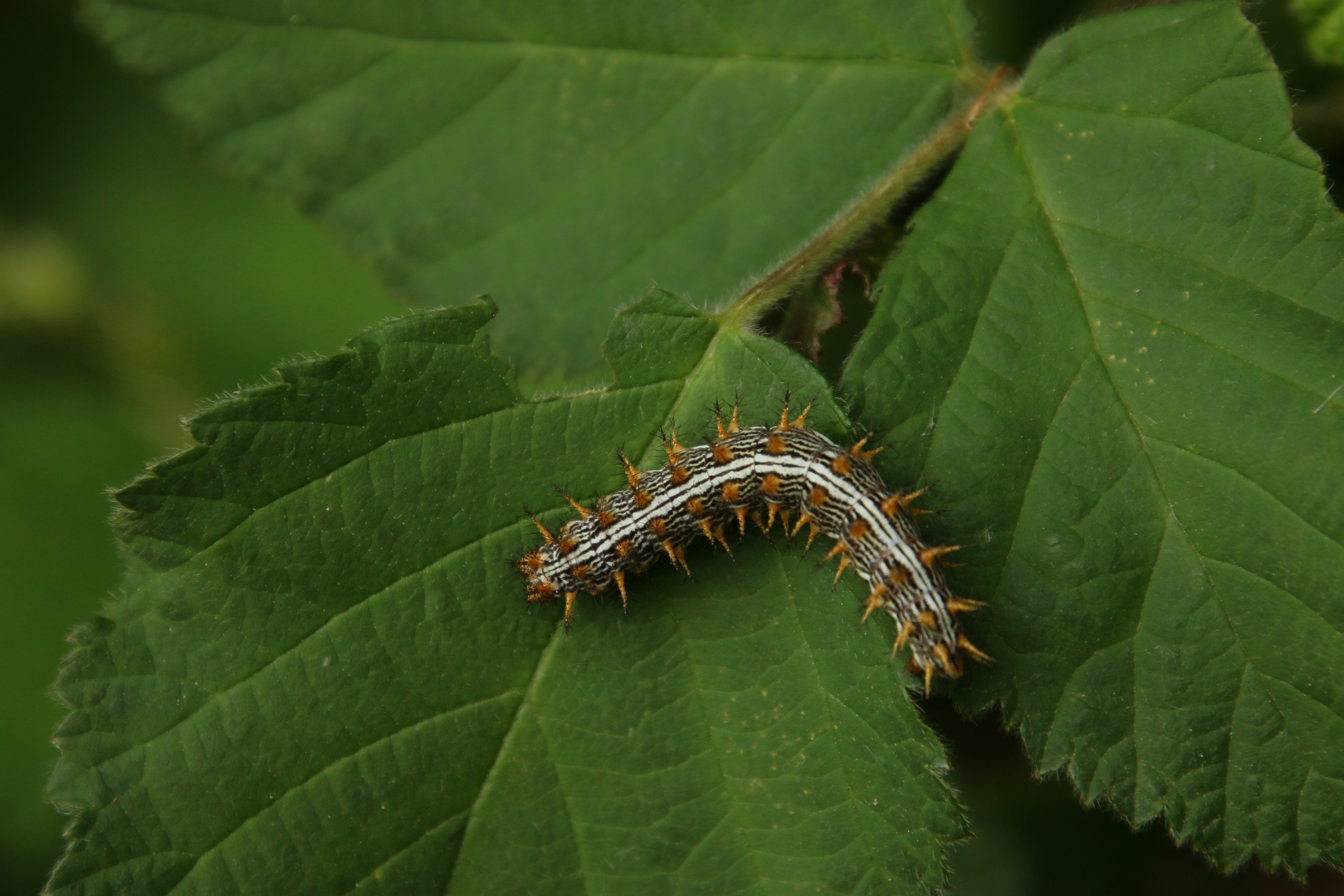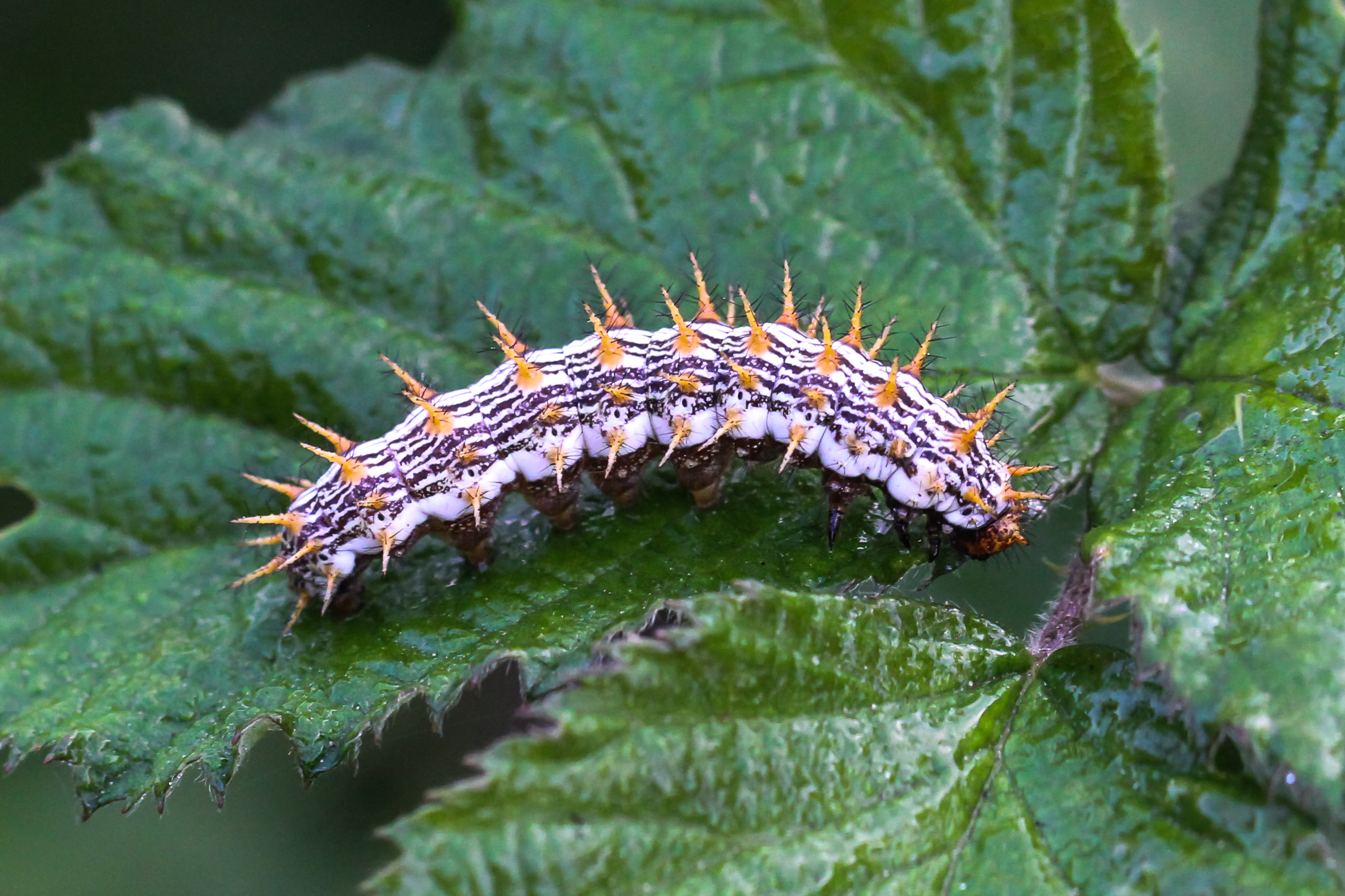 Chenille : la chenille est ressemblante à celles des autres nacrés avec des lignes blanches longitudinales et des protubérances orange.